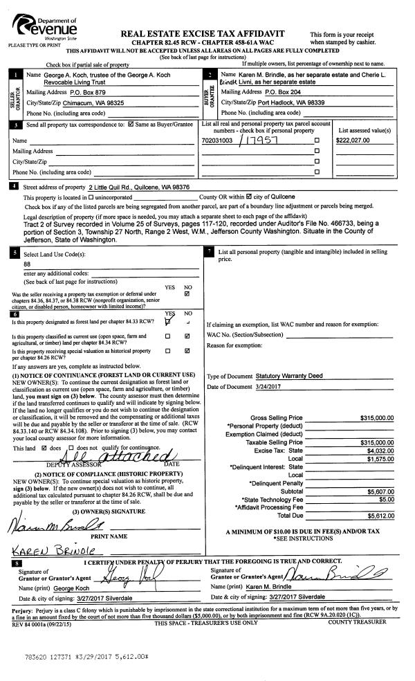 | 3 | 03/24/2017 | SWD | Statutory Warranty Deed | GEORGE KOCH REV TRUST | KAREN M BRINDLE | | | $315,000.00 | 127371 | |