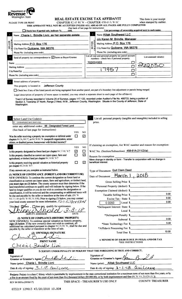 | Mailing Address: | C/O KAREN BRINDLE PO BOX 176 QUILCENE, WA 98376-0176 | % Ownership: | 100.0000000000% |