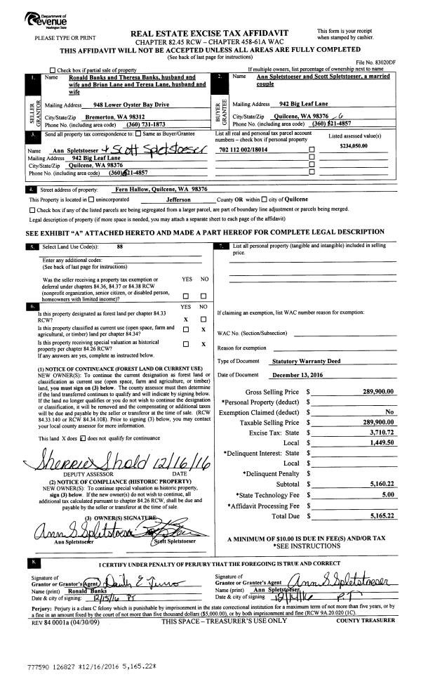 | 1 | 12/13/2016 | SWD | Statutory Warranty Deed | RONALD BANKS | ANN & SCOTT SPLETSTOESER | | | $289,900.00 | 126827 | |