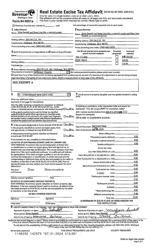 | 1 | 07/30/2024 | QCD | Quit Claim Deed | BRIAN SANDALL & SUNG LING HSU | MARY J SANDALL | | | | 142979 | |