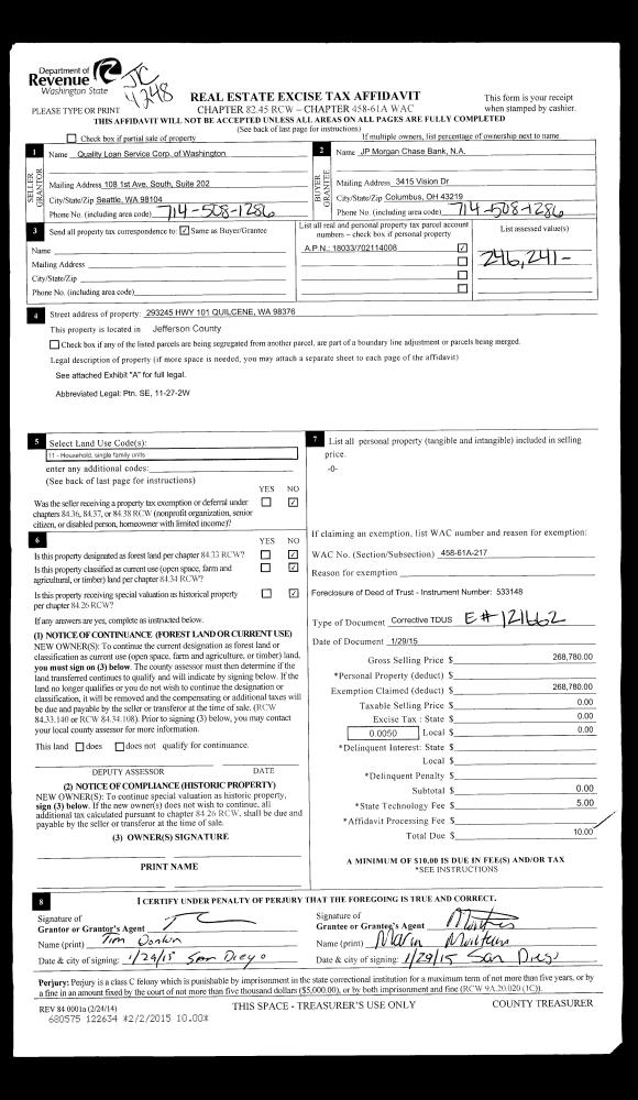 | 9 | 08/01/2014 | TRED | Trustee Deed | QUALITY LOAN SERVICE CORP | JPMORGAN CHASE BANK, NAT'L ASSOC | | | | 121662 | |