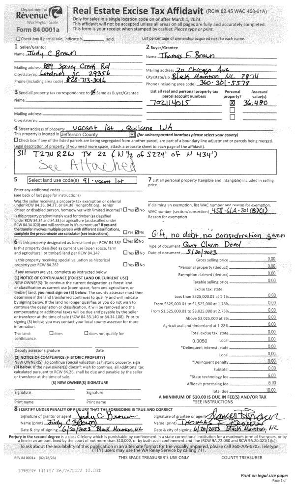 | 3 | 05/30/2023 | QCD | Quit Claim Deed | JUDY C BROWN | THOMAS F BROWN | | | | 141107 | |