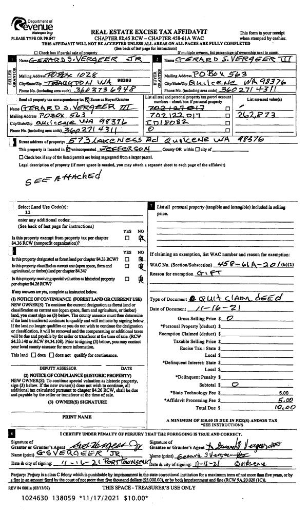 | 2 | 11/16/2021 | QCD | Quit Claim Deed | GERARD S VERGEER JR | GERARD S VERGEER III | | | | 138059 | |