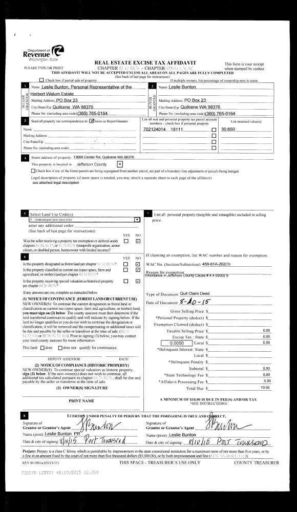| 2 | 08/10/2015 | QCD | Quit Claim Deed | HERBERT WALUM | LESLIE A BUNTON | | | | 123737 | |