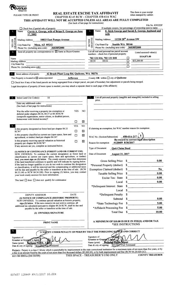 | 5 | 01/19/2007 | QCD | Quit Claim Deed | GEORGE, CARRIE A | GEORGE, BRIAN E | 0 | 0 | $0.00 | 108448 | 0 |