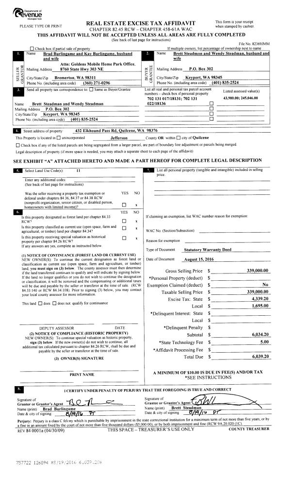| 3 | 08/15/2016 | SWD | Statutory Warranty Deed | BRAD LEE BURLINGAME | BRETT & WENDY STEADMAN | | | $339,000.00 | 126094 | |