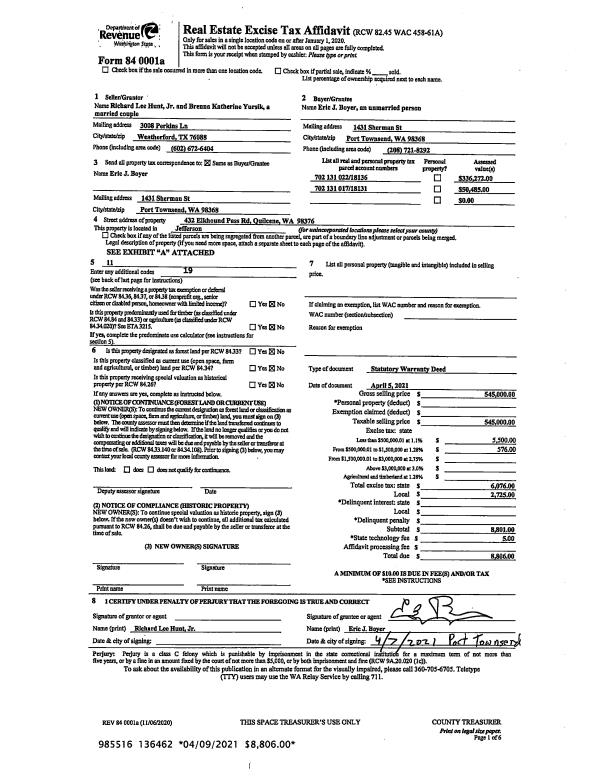 | 1 | 04/05/2021 | SWD | Statutory Warranty Deed | RICHARD L HUNT JR | ERIC J BOYER | | | $545,000.00 | 136462 | |