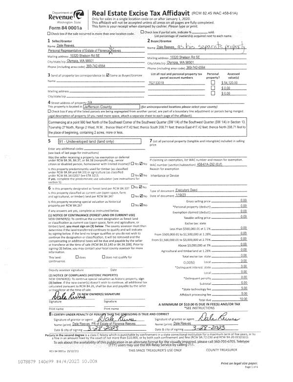 | 1 | 01/19/2023 | EXD | Executor's Deed | FLORENCE JANET REEVES | DALE REEVES | | | | 140699 | |
