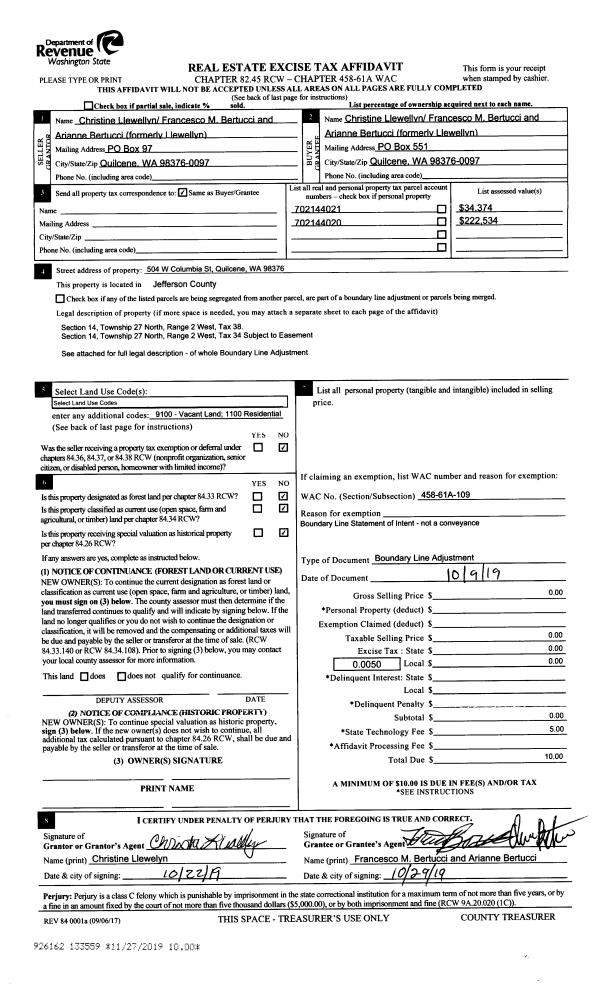 | 2 | 11/27/2019 | BLA | Boundary Line Adjustment | | CHRISTINE LLEWELLYN | | | | 133559 | |