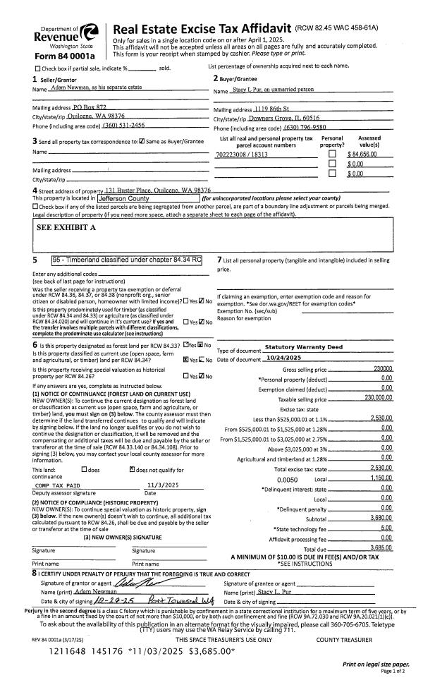 | 1 | 10/24/2025 | SWD | Statutory Warranty Deed | ADAM NEWMAN | STACY L PUR | | | $230,000.00 | 145176 | |