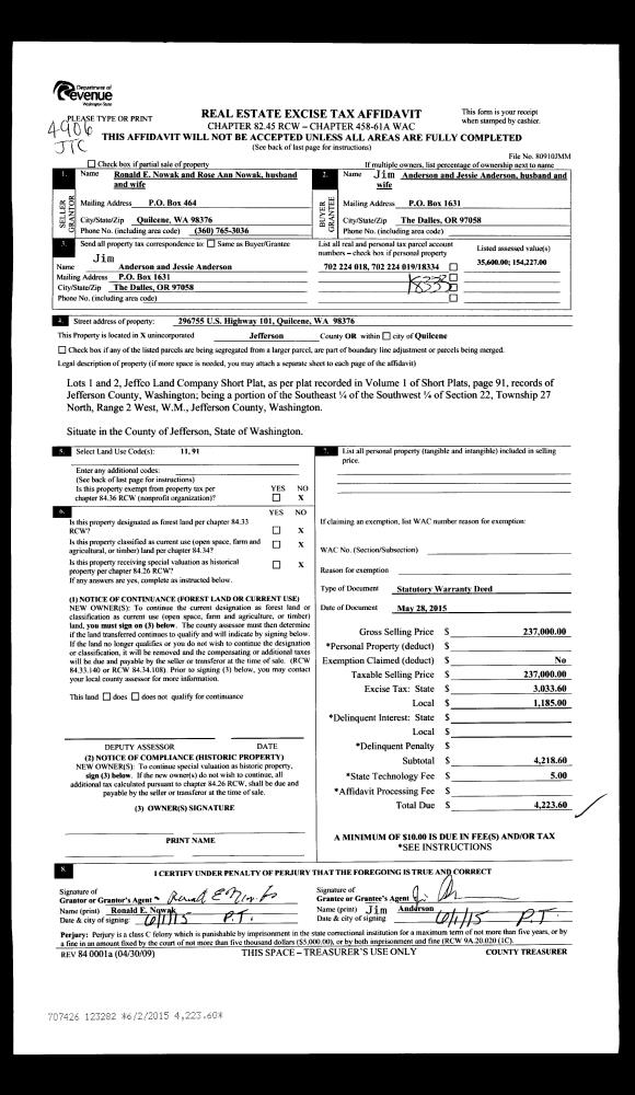 | 4 | 05/28/2015 | SWD | Statutory Warranty Deed | RONALD E NOWAK | JIM & JESSIE ANDERSON | | | $237,000.00 | 123282 | |