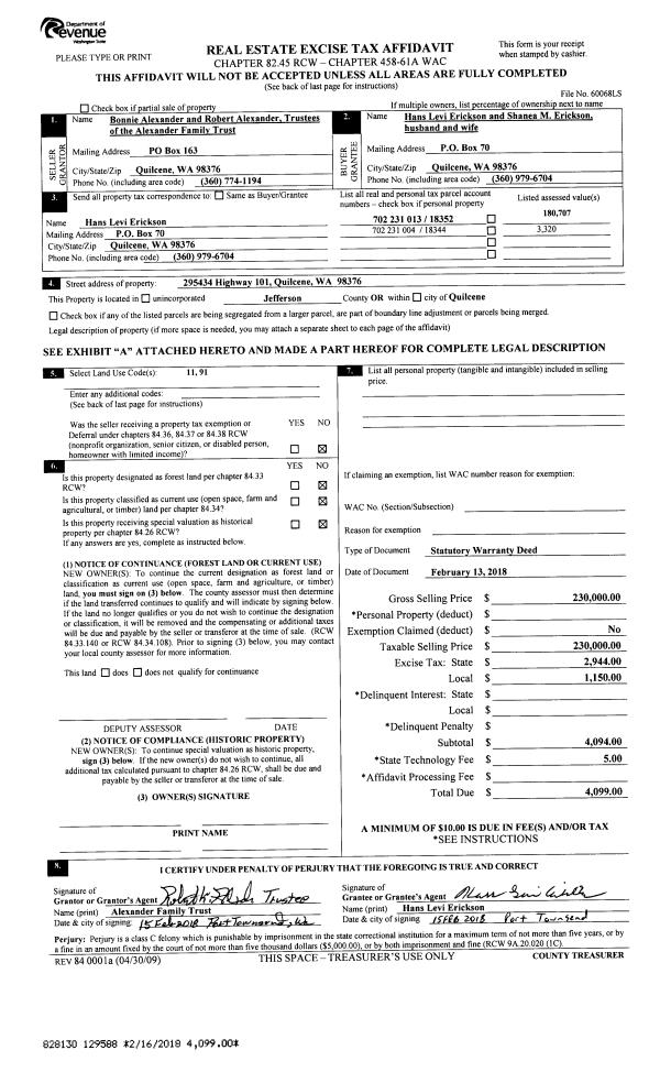 | 1 | 02/13/2018 | SWD | Statutory Warranty Deed | ALEXANDER FAMILY TRUST | HANS L & SHANEA M ERICKSON | | | $230,000.00 | 129588 | |