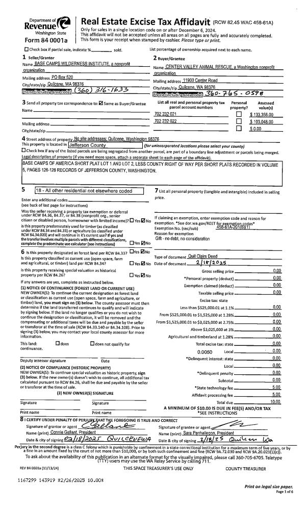| 1 | 02/18/2025 | QCD | Quit Claim Deed | BASE CAMPS WILDERNESS INSTITUTE | CENTER VALLEY ANIMAL RESCUE | | | | 143919 | |