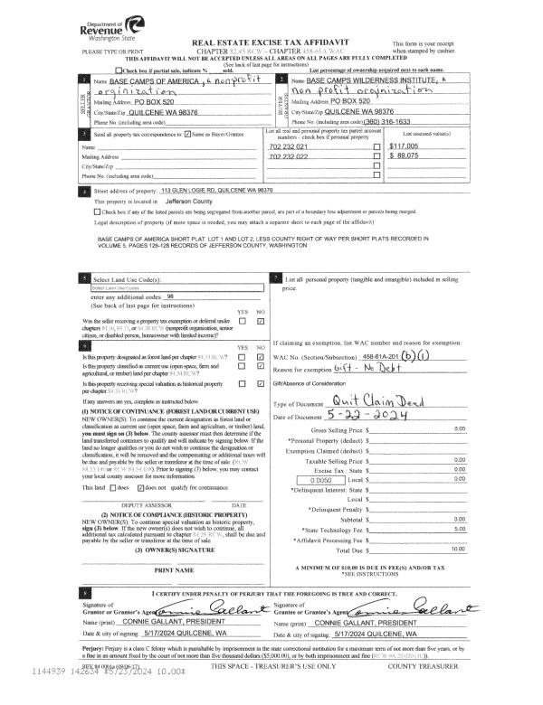 | 2 | 05/22/2024 | QCD | Quit Claim Deed | BASECAMPS OF AMERICA INC | BASE CAMPS WILDERNESS INSTITUTE | | | | 142634 | |