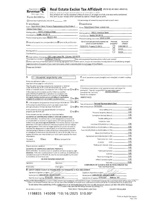 | 1 | 10/15/2025 | SWD | Statutory Warranty Deed | ROBERT STEAD | SUSAN E STEAD | | | | 145108 | |