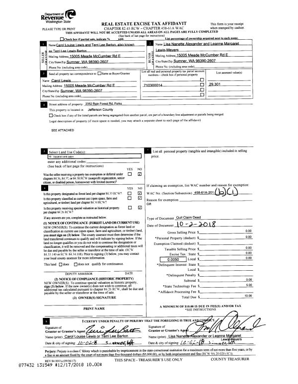 | 1 | 10/02/2018 | QCD | Quit Claim Deed | CAROL LEWIS | LISA N ALEXANDER | | | | 131549 | |
