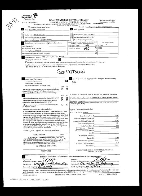 | 1 | 10/08/2014 | QCD | Quit Claim Deed | ALIX AND ALIX INCORPORATED | CAROLA ALIX | | | | 122262 | |
