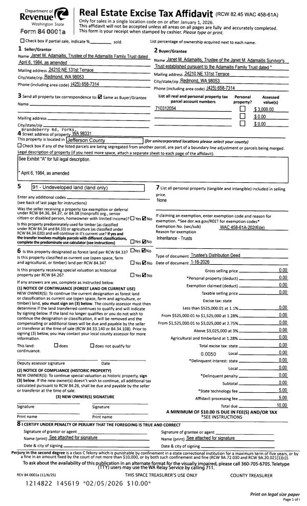| 1 | 01/16/2026 | TRED | Trustee Deed | DONALD M ADAMAITIS TRUST | JANET ADAMAITIS SURVIVOR'S TRUST | | | | 145619 | |