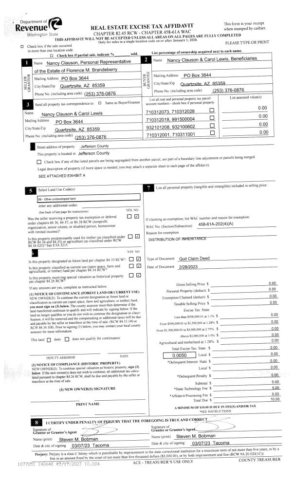 | 2 | 02/28/2023 | QCD | Quit Claim Deed | FLORENCE BRANDEBERRY | NANCY CLAUSON | | | | 143777 | RERCD 140640/143424 |