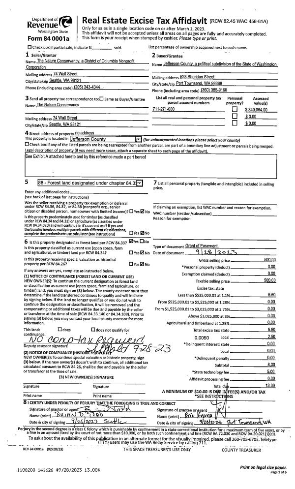 | 1 | 09/28/2023 | EASE | Assignment of Easement | THE NATURE CONSERVANCY | JEFFERSON COUNTY | | | | 141626 | |