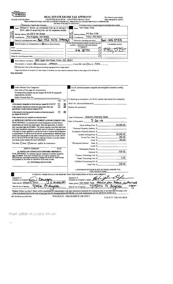 | 1 | 07/20/2016 | SWD | Statutory Warranty Deed | WILLIAM A SMITH | HOH INDIAN TRIBE | | | $30,000.00 | 125885 | |