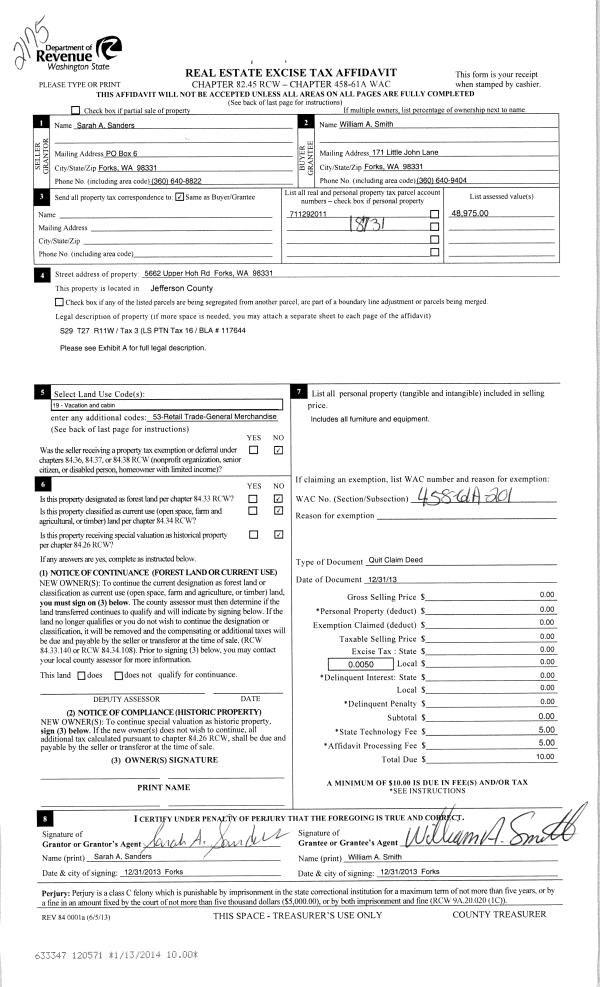 | 3 | 11/14/2013 | QCD | Quit Claim Deed | SARAH A SANDERS | WILLIAM A SMITH | | | | 120376 | |
