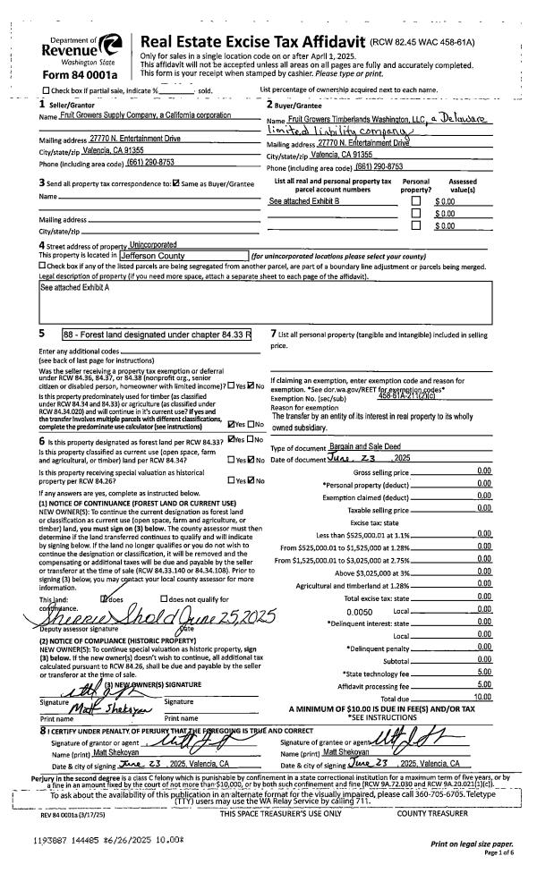 | 1 | 06/23/2025 | BSD | Bargain and Sale Deed | FRUIT GROWERS SUPPLY COMPANY | FRUIT GROWERS TIMBERLANDS WASHINGTON LLC | | | | 144485 | |