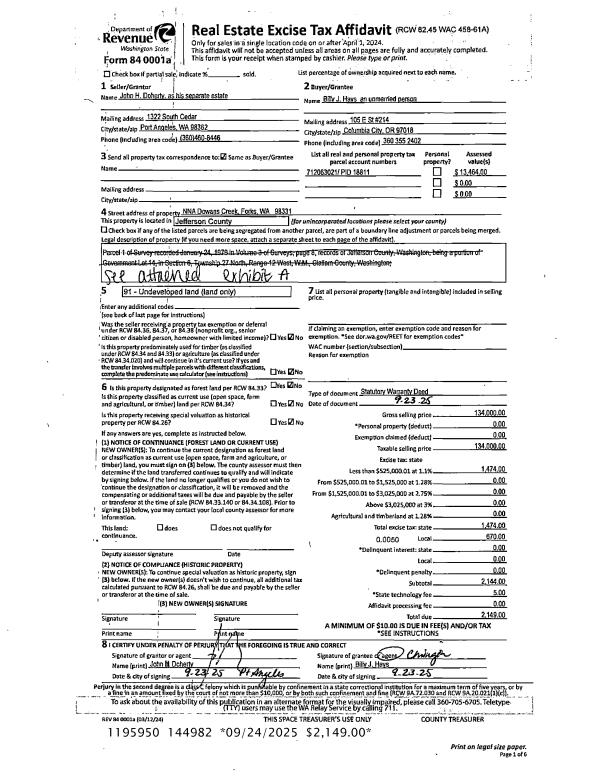 | 1 | 09/23/2025 | SWD | Statutory Warranty Deed | JOHN H DOHERTY | BILLY J HAYS | | | $134,000.00 | 144982 | |