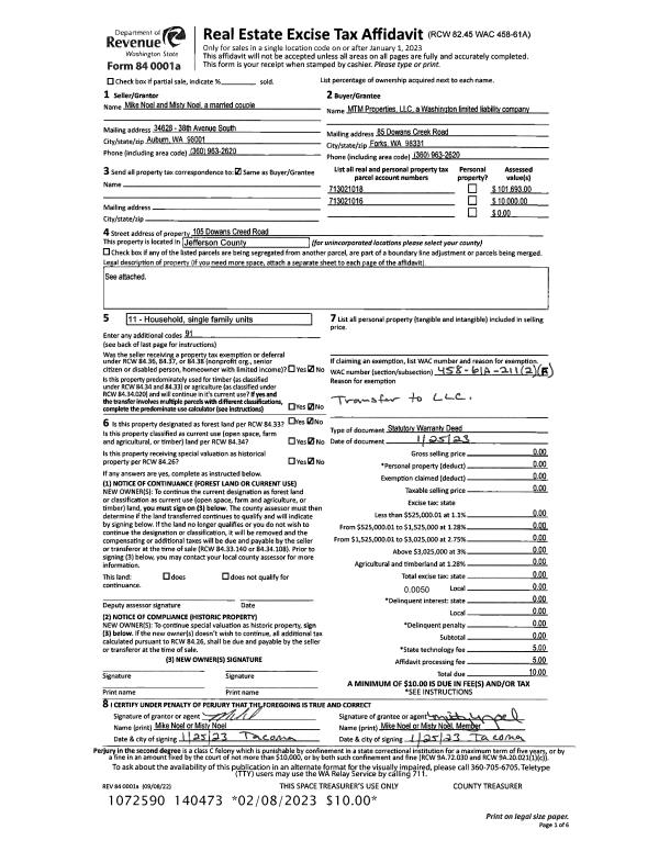 | 1 | 01/25/2023 | SWD | Statutory Warranty Deed | MICHAEL D & MISTY L NOEL | MTM PROPERTIES LLC | | | | 140473 | |