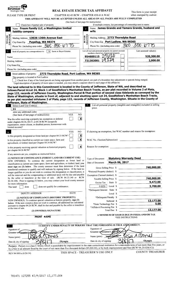 | 1 | 03/06/2017 | SWD | Statutory Warranty Deed | FROOM FAMILY LLC | JAMES & TAMARA GRANDE | | | $740,000.00 | 127255 | |
