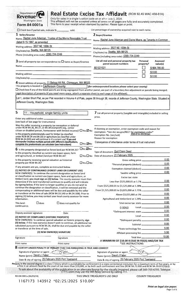 | 2 | 02/21/2025 | QCD | Quit Claim Deed | KRISTINE MORRIS | RACHEL J ADAMIAN | | | | 143912 | |