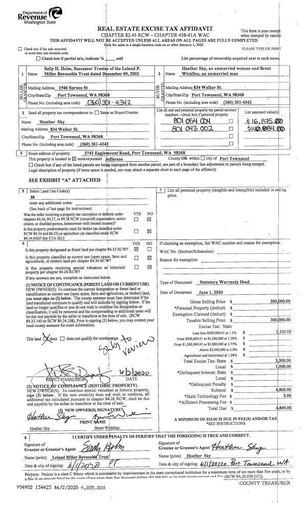 | 1 | 06/01/2020 | SWD | Statutory Warranty Deed | LELAND P MILLER TRUSTEE | HEATHER SKY | | | $300,000.00 | 134423 | |