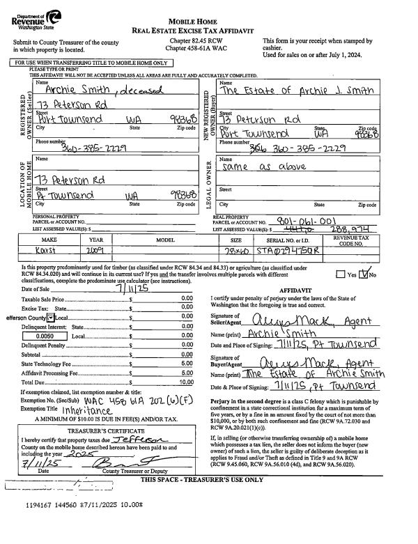 | 2 | 07/11/2025 | MH | Mobile Home | COLLEEN A SMITH | ESTATE OF ARCHIE J SMITH | | | | 144560 | |