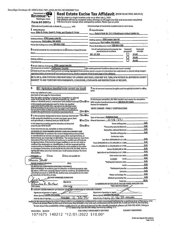 | 1 | 11/18/2022 | QCD | Quit Claim Deed | BRIAN S PORTER | PORTERS BACK 40 LLC | | | | 140212 | |