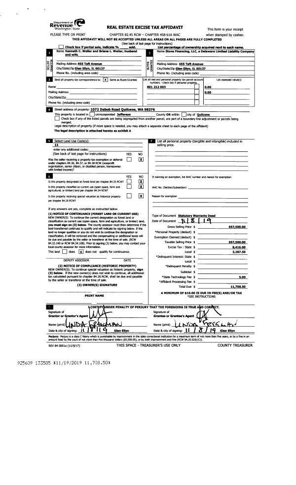 | 3 | 11/08/2019 | SWD | Statutory Warranty Deed | KENNETH C WELLER | STONE FINANCING LLC | | | $657,500.00 | 133505 | |