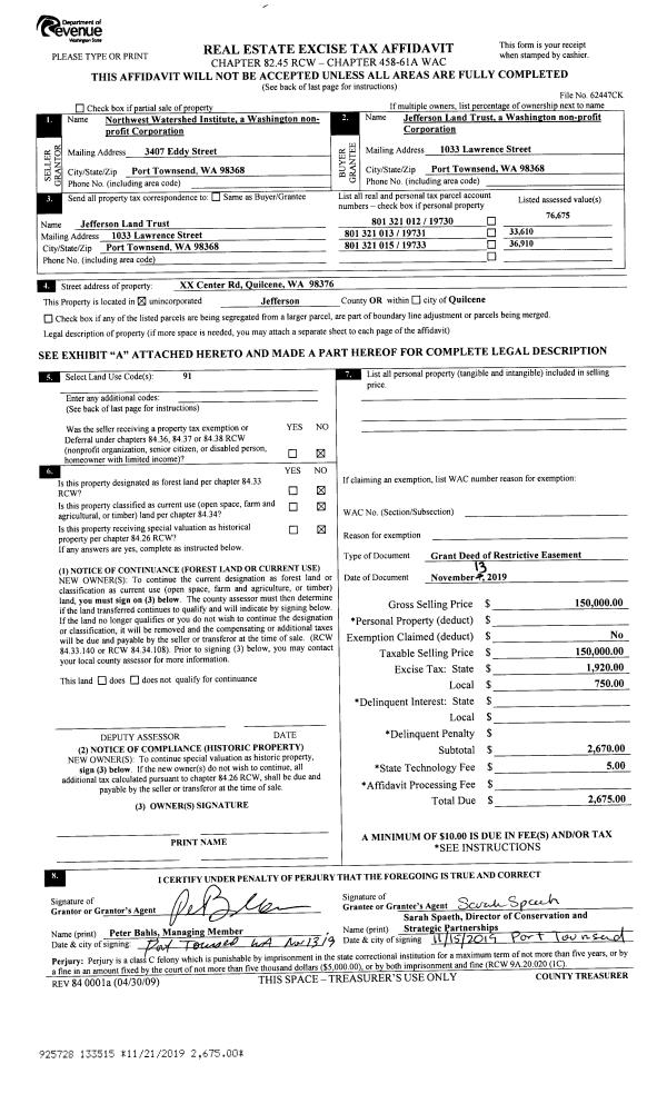 | 2 | 11/07/2019 | CONS EASE | CONSERVATION EASEMENT | NORTHWEST WATERSHED INSTITUTE | JEFFERSON LAND TRUST | | | $150,000.00 | 133515 | |