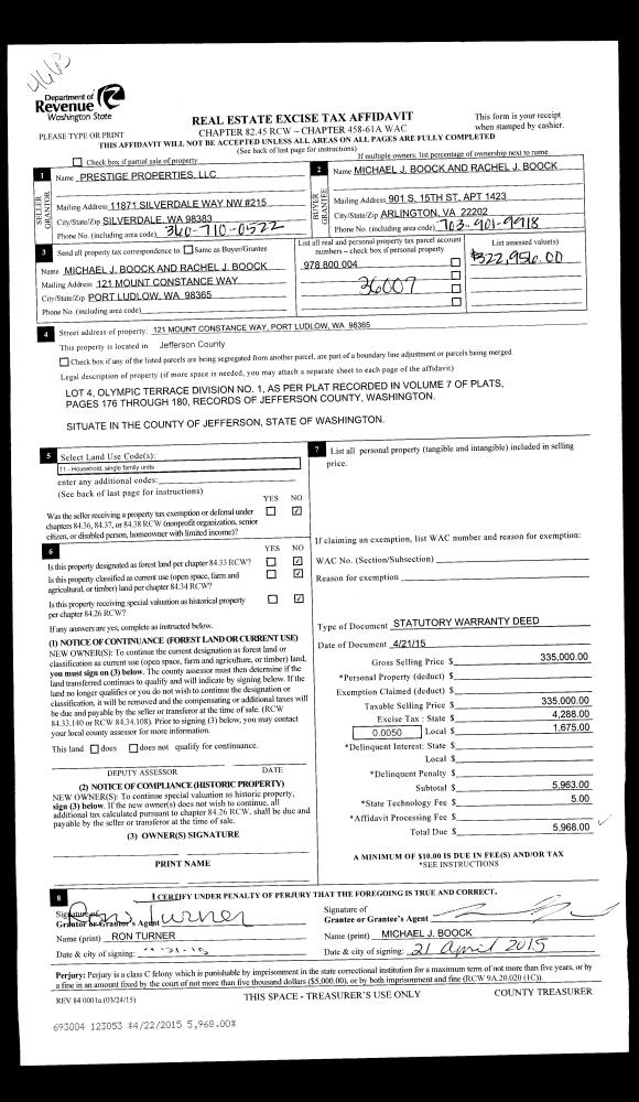 | 2 | 04/07/2015 | SWD | Statutory Warranty Deed | ROGER D WELLER | RUSTIN BROWN & YUNG HSU CHEN | | | $86,475.00 | 123052 | |