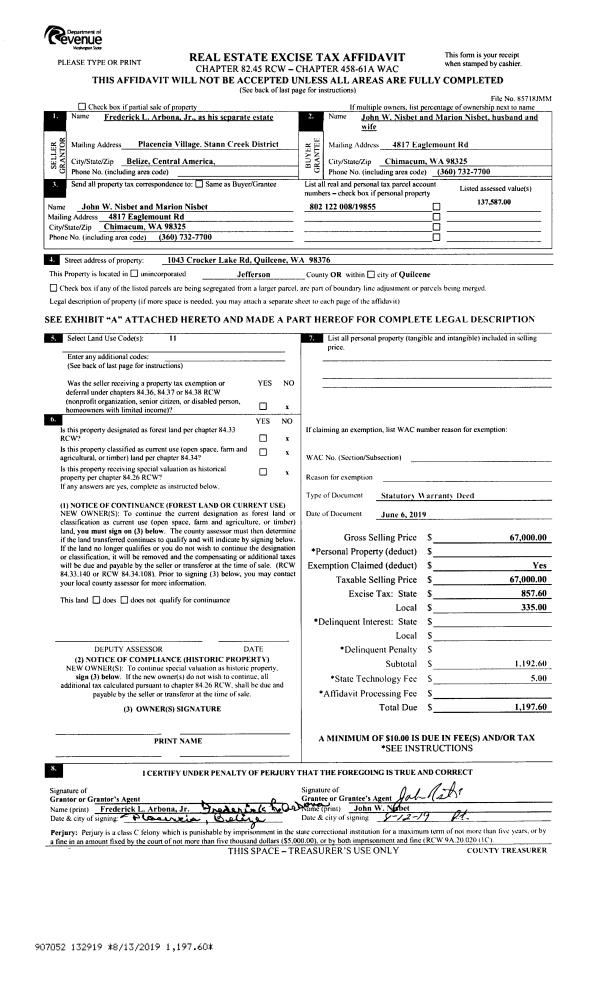 | 1 | 06/06/2019 | SWD | Statutory Warranty Deed | FRED ARBONA JR | JOHN & MARION NISBET | | | $67,000.00 | 132919 | |