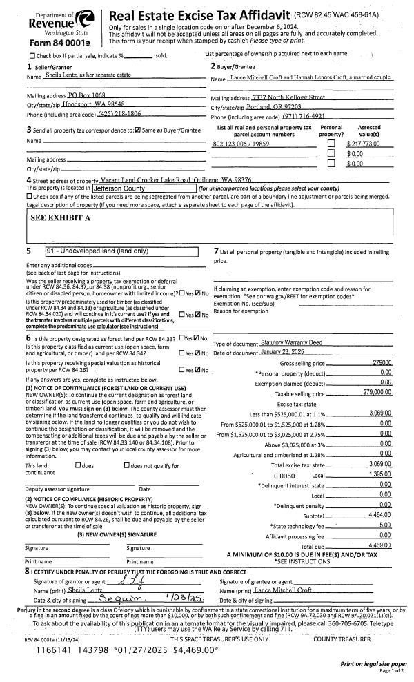 | 1 | 01/23/2025 | SWD | Statutory Warranty Deed | SHEILA LENTZ | LANCE M & HANNAH L CROFT | | | $279,000.00 | 143798 | |