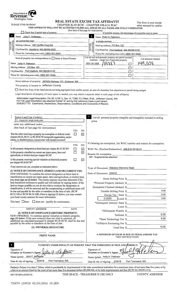 | 2 | 02/24/2016 | SWD | Statutory Warranty Deed | JOHN F HOFFSTATER | HOLLY H PETERSON | | | | 124917 | |