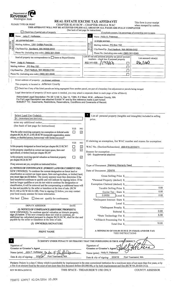 | 2 | 02/24/2016 | SWD | Statutory Warranty Deed | JOHN F HOFFSTATER | HOLLY H PETERSON | | | | 124918 | |