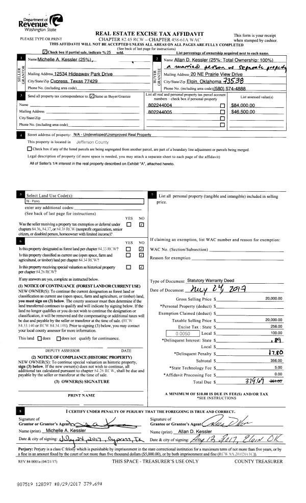 | 1 | 07/24/2017 | SWD | Statutory Warranty Deed | ALLAN D KESSLER | ALLAN D KESSLER | | | $20,000.00 | 128397 | |