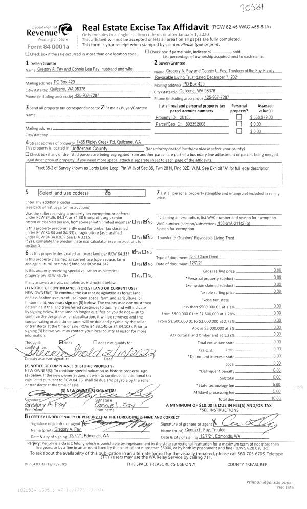 | 2 | 12/07/2021 | QCD | Quit Claim Deed | GREGORY A FAY | FAY FAMILY REVOCABLE LIVING TRUST | | | | 138516 | |