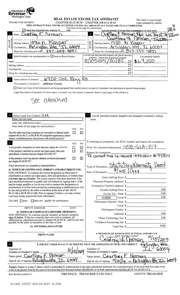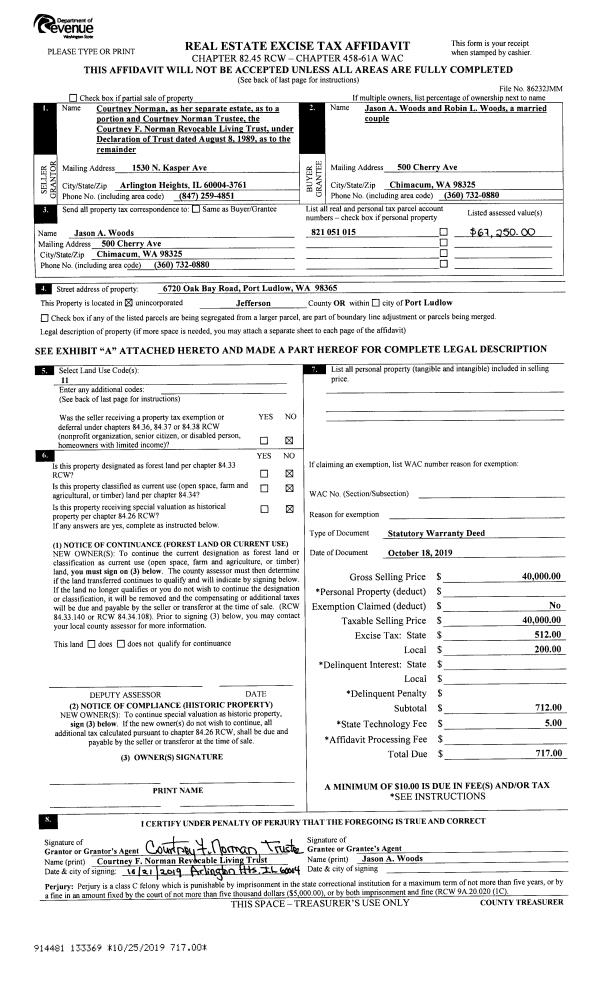 | 1 | 10/18/2019 | SWD | Statutory Warranty Deed | COURTNEY F NORMAN TRUSTEE | JASON J & ROBIN L WOODS | | | $40,000.00 | 133369 | |
