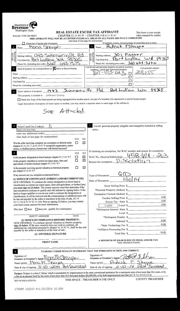 | Mailing Address: | 481 LUDLOW BAY RD PORT LUDLOW, WA 98365-8728 | % Ownership: | 100.0000000000% |