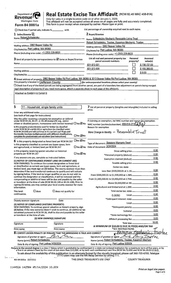 | 1 | 03/20/2024 | SWD | Statutory Warranty Deed | ROBERT P SCHLADETZKY | SCHLADETZKY MECHANIC REVOCABLE LIVING TRUST | | | | 0 | |