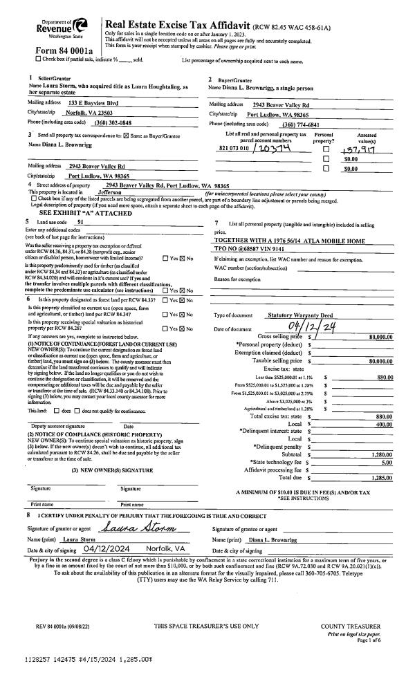 | 1 | 04/12/2024 | SWD | Statutory Warranty Deed | LAURA STORM | DIANA L BROWNRIGG | | | $80,000.00 | 142475 | |