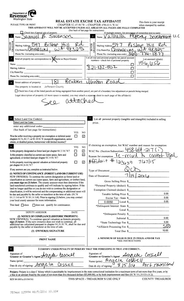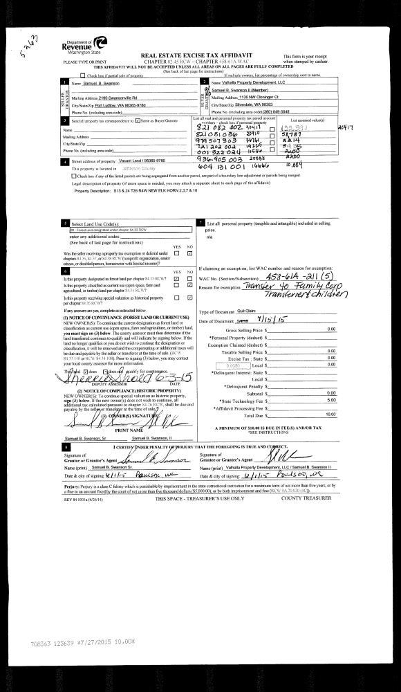 | 5 | 07/15/2015 | QCD | Quit Claim Deed | | VALHALLA PROPERTY DEVELOPMENT LLC | | | | 123639 | |