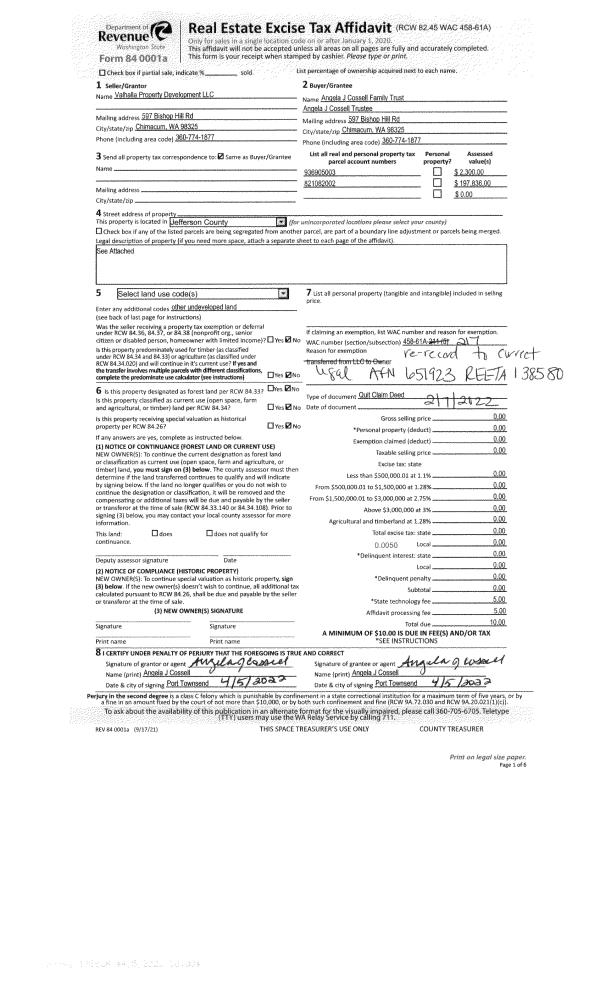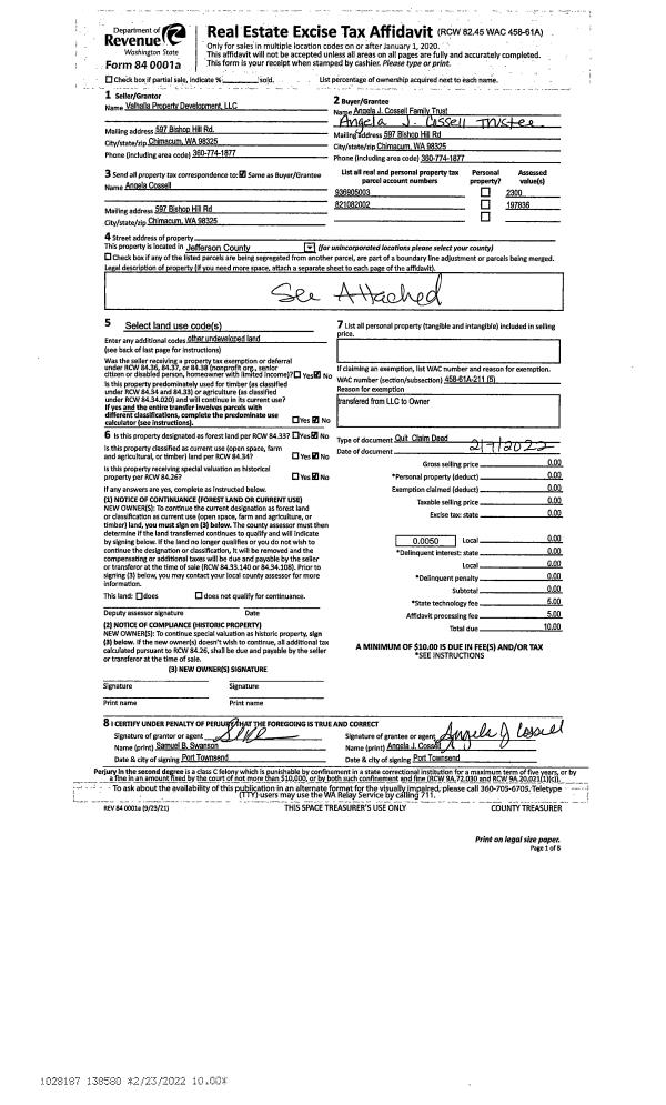 | 3 | 02/07/2022 | QCD | Quit Claim Deed | VALHALLA PROPERTY DEVELOPMENT LLC | ANGELA J COSSELL FAMILY TRUST | | | | 138580 | |