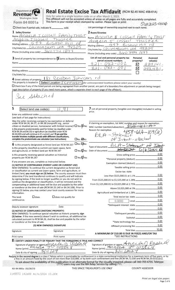 | 2 | 06/06/2024 | BLA | Boundary Line Adjustment | ANGELA J COSSELL FAMILY TRUST | ANGELA J COSSELL FAMILY TRUST | | | | 142688 | |